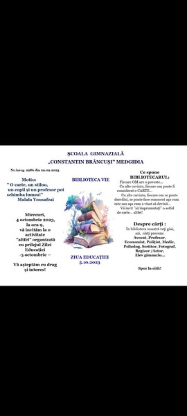 Miercuri, 4 octombrie 2023, am avut invitați cu povești de succes, la o activitate ”altfel”, organizată cu prilejul Zilei Educaţiei, 5 octombrie, intitulată “Biblioteca vie”.