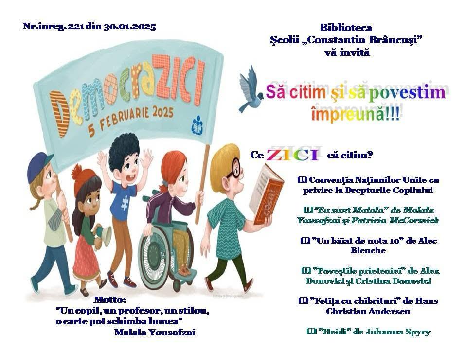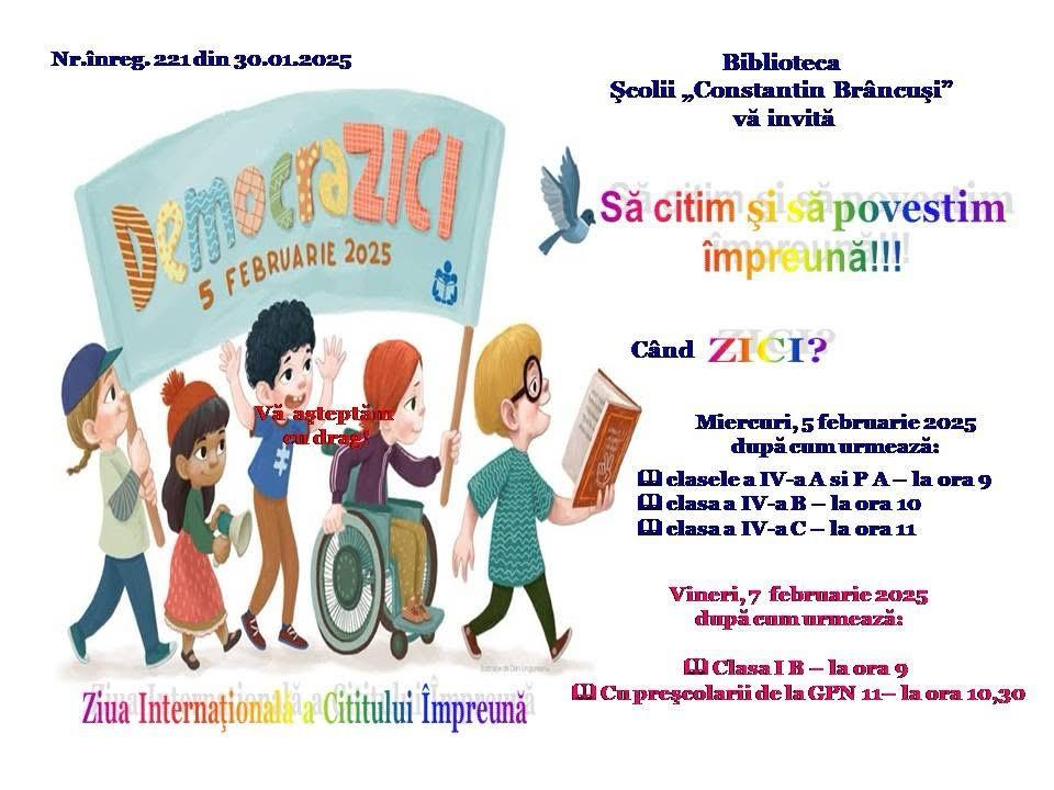 \ În acest an, Ziua Internaţională a Cititului Împreună s-a desfăşurat sub sloganul DEMOCRAZICI, minunat prilej de reflectare asupra puterii cuvântului şi a lecturii ca instrumente esenţiale în consolidarea democraţiei şi a drepturilor fundamentale ale fiecărui om.