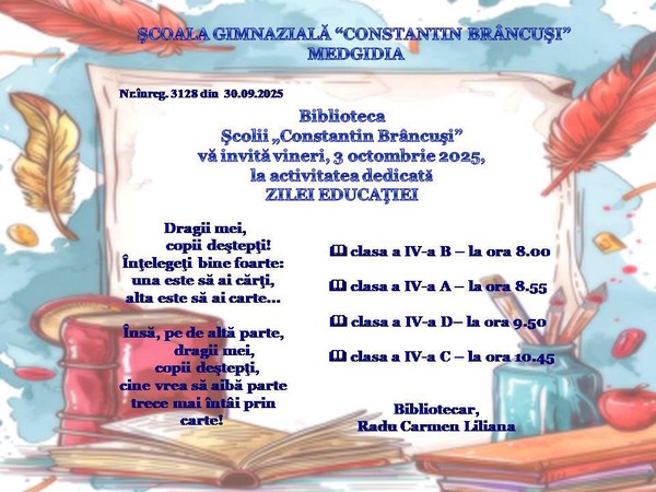 Este ziua în care ne amintim că fiecare profesor, fiecare elev și fiecare carte deschisă contribuie la construirea unei lumi mai bune. Educația nu se limitează la școală, ci ne însoțește toată viața, modelându-ne felul de a gândi, de a simți și de a acționa.